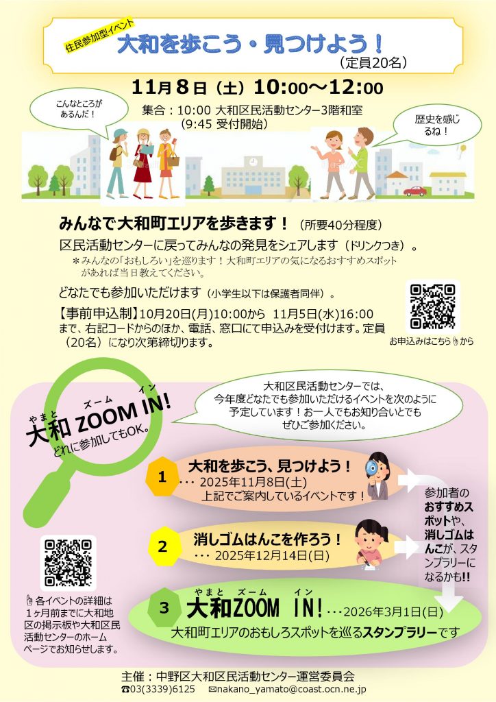 各イベントの詳細は開催日の1ヶ月前位から大和町の掲示板や当センター運営委員会のホームページに掲載し、ご案内いたします。窓口、電話、メールでお問い合わせいただくことも可能ですので、お気軽にご連絡ください! ⇒ ☏ 03(3339)6125 ✉ nakano_yamato@coast.ocn.ne.jp