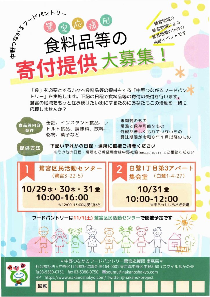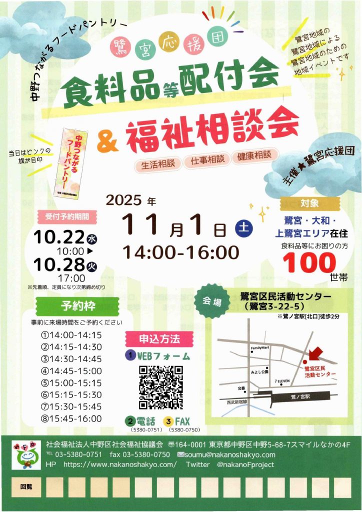 11月1日(土)14:00~16:00 鷺宮区民活動センター(中野区鷺宮3ー22ー5)を会場に、食料品等配布会&福祉相談会(フードパントリー)が開催されます!