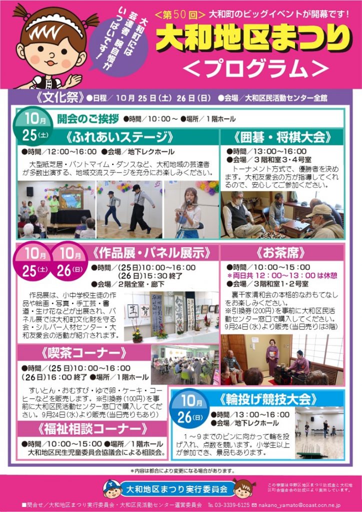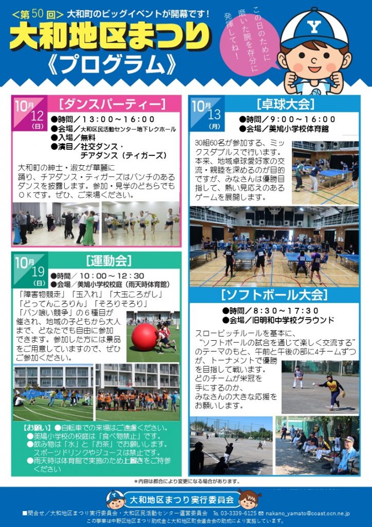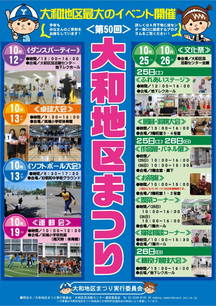 2025年10月9日 / 最終更新日時 : 2025年10月9日 yamato 地域情報 第50回大和地区まつりが開催されます! 今月12日(日)のダンスパーティーを皮切りに、第50回大和地区まつりが開催されます!13日(月・祝)は卓球大会(開場:美鳩小学校)とソフトボール大会(開場:旧明和中学校グラウンド)、19日(日)は運動会(開場:美鳩小学校)、25日(土)・26日(日)は文化祭(開場:大和区民活動センター)が開催されます! 特に、19日の運動会と25日・26日の文化祭は、ご来場いただければ、だれでも楽しめる内容ですので、ぜひご参加くださいますようお願いいたします!