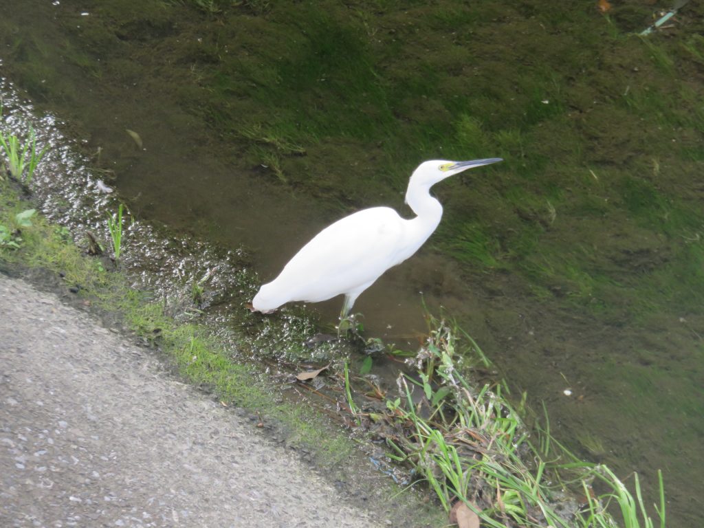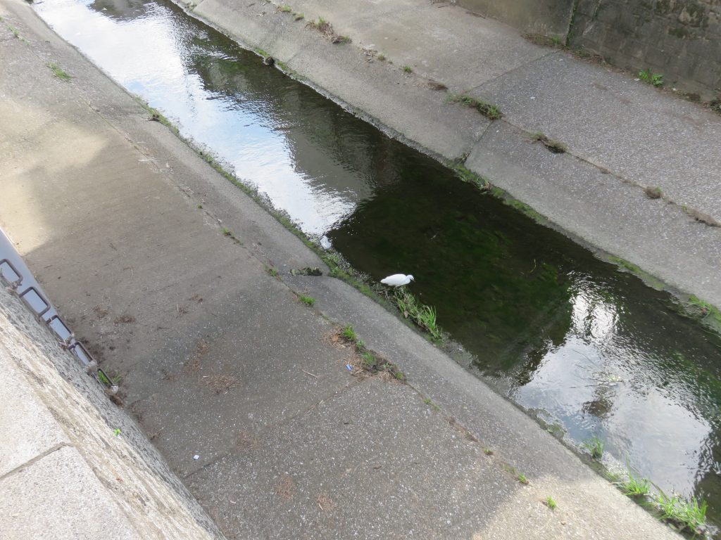 妙正寺川・たいよう橋のあたりをふっと見ると、白鷺が川を歩いているのを発見!