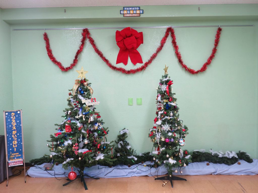 大和区民活動センター1階ホールでは、12月1日(月)より展示「季節感のあるホール作り クリスマスがいっぱい!」のため、クリスマスツリーやリースなどが飾られています。