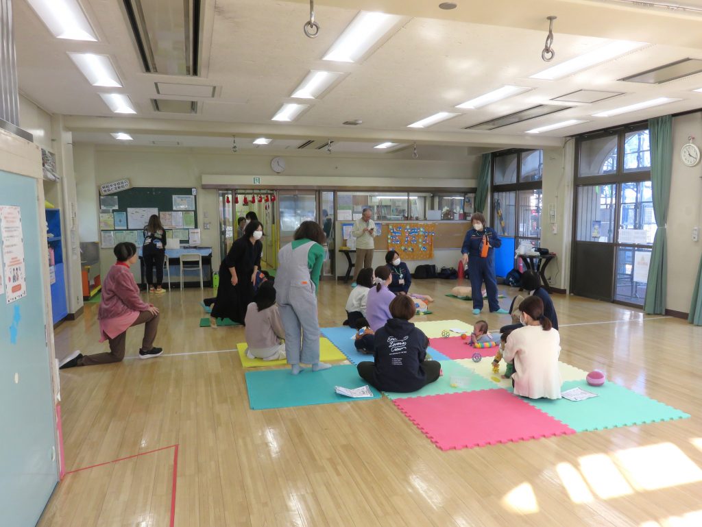 大和児童館を会場に、野方消防団・第5分団のみなさんを講師に迎え、乳幼児向けの救命講習会が開催されました。