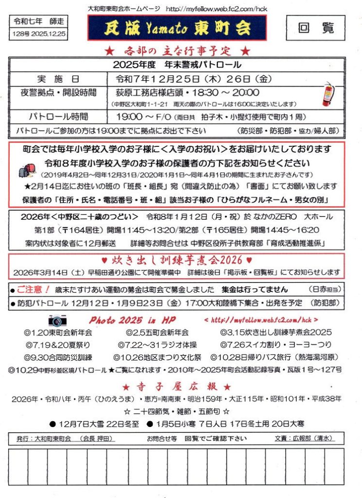 2025年12月5日 / 最終更新日時 : 2025年12月5日 yamato 地域情報 東町会さんの12月瓦版が発行されました! 東町会さんの12月瓦版が発行されました! 以下のアドレスより、ぜひご覧くださいますようお願いいたします! 【myfellow.web.fc2.com/hck/kwb/R7/25128.html】