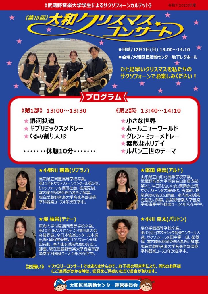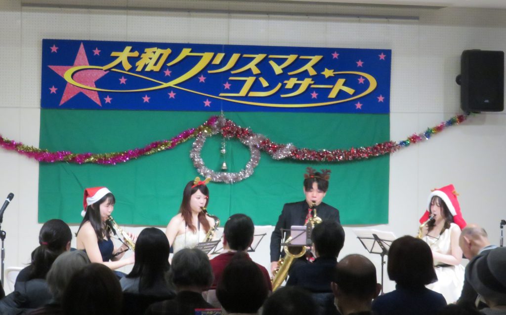 武蔵野音楽大学の学生さん4名による、サクソフォーンカルテットの素敵な演奏が、大和地域に響き渡りました!