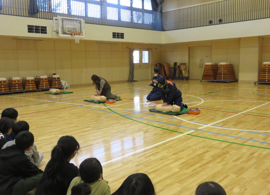 3年生の社会科の授業で、消防団の方をゲストティーチャーに迎えて、①救命講習・AED体験、②初期消火・消火器体験、③消防団の装備と3コーナーを体験していました。子どもたちは実際に見て・触れることで、消防団の活動や実際に自分の身の回りで起きた時にはどのような行動をとればいいのかを学んでいました!