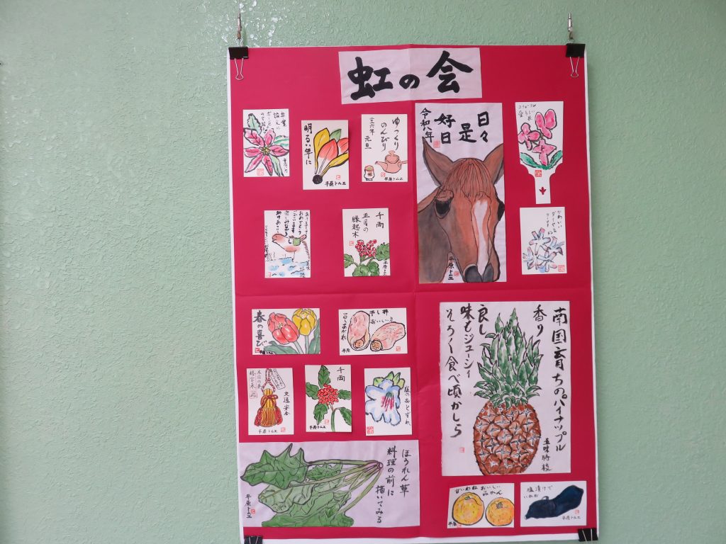 虹の会では、会員のみなさんは季節にちなんだ野菜、果物、植物、動物や興味のあるモチーフを基に絵手紙を制作しています。皆さんが描かれる、優しい絵と温かい言葉のハーモニーにいつも癒されます。