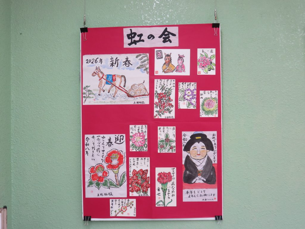 本日、1階ギャラリーにて、虹の会による「新春の絵手紙展」の作品が展示されました。